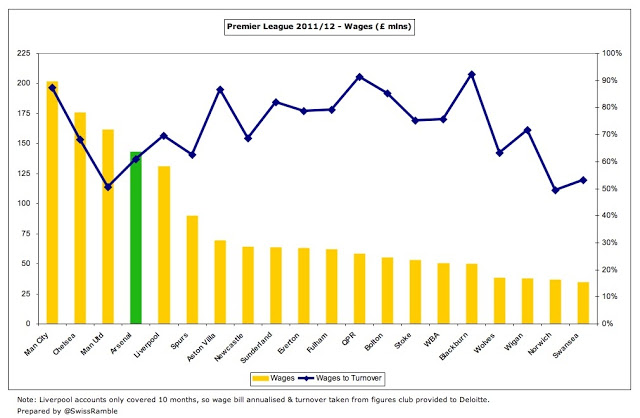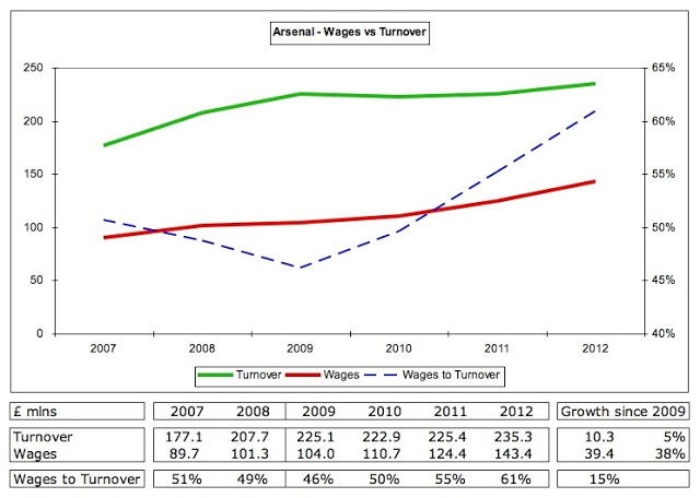 Несомненно, рост зарплатной ведомости является причиной для беспокойства для «Арсенала». С 2009-ого ведомость выросла на 38% до 143 миллионов, хотя доход увеличился только на 5% за тот же период – коммерческое отделение клуба может по праву критиковаться за то, что не сумело найти «вторичного спонсора». В сезоне 2012/13 зарплатная ведомость вырастет еще больше из-за переподписаний британских игроков до 150 млн фунтов. С другой стороны, грядущее увеличение доходов до 300 млн фунтов означает, что зарплатную ведомость можно поднять до 180 млн (для отношения зарплат к доходам на уровне 60%).