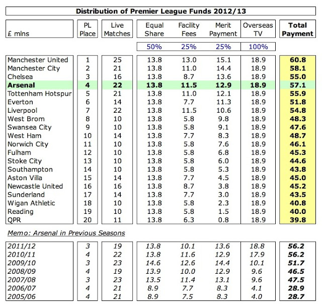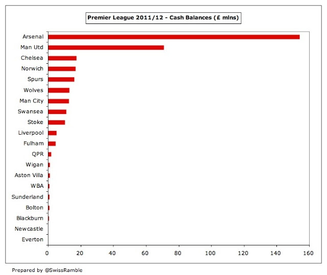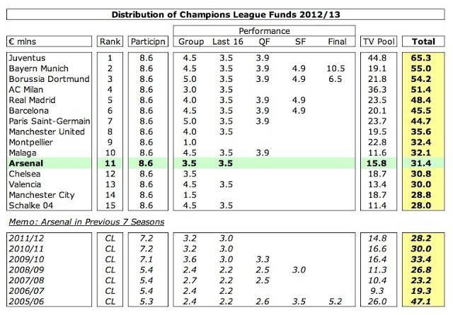 Как бы там ни было, осторожный подход «Арсенала» стоил клубу денег. Распределение выручки от продажи прав на трансляции в Премьер-Лиге относительно эгалитарное: в сезоне 2011/12 каждое дополнительное место в таблице добавляло лишь 800,000 фунтом к деньгам, получаемым клубом. Однако более значительной выглядит разница в Лиге Чемпионов: «Арсенал» заработал 28 миллионов евро, вылетев в 1/8, в то время как победа «Челси» принесла клубу 60 млн евро.
