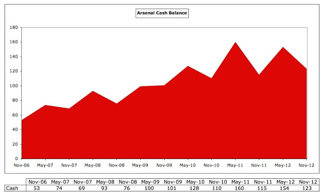 В течение последних лет в балансе наличных «Арсенала» наблюдался постоянный рост: с 2007-ого по 2012-ый сумма выросла с 74 до 154 миллионов фунтов. Цифра в 123 миллиона была озвучена в последнем промежуточном отчете, но она скорее отражает сезонность потоков наличных в течение года: например, май – всегда «высокий» месяц из-за обновления сезонных абонементов, в то время как ноябрь связан с тратами, в особенности, выплатами зарплат. Тенденция к росту может быть заметна и здесь, так как соответствующая цифра годом ранее была ниже на 8 млн фунтов. Однако это не означает, что вся эта сумма доступна для трансферов. Все не так просто из-за многих факторов, например то, что нужно оставлять деньги на эти надоедливые выплаты. Конечно, другие деньги также будут поступать в клуб в течение сезона – доля от продажи прав на трансляции и розничная торговля – хотя совершенно необязательно, что все будет сразу конвертироваться в наличные (например, все 55 миллионов фунтов по сделке с Найком на 7 лет с 2004 по 2011 были целиком выплачены к июлю 2006-ого на постройку стадиона).