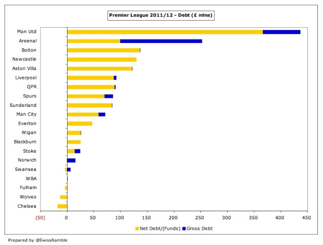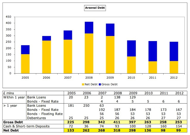 Долг, связанный с постройкой стадиона, все еще оказывает влияние на стратегию «Арсенала». И хотя Гари Невилл, среди прочих, считает, что это больше не имеет значения, на самом деле это определенно является фактором: общая сумма долга на конец сезона 2011/12 равнялась 253 миллионам фунтов. Сумма состоит из долгосрочных облигаций, представленных в виде «ипотеки» на стадион (225 миллионов) и долговых обязательств перед болельщиками (27 миллионов). По сути, только у «Манчестер Юнайтед» долг выше, в результате LBO, организованного семьей Глэйзеров.