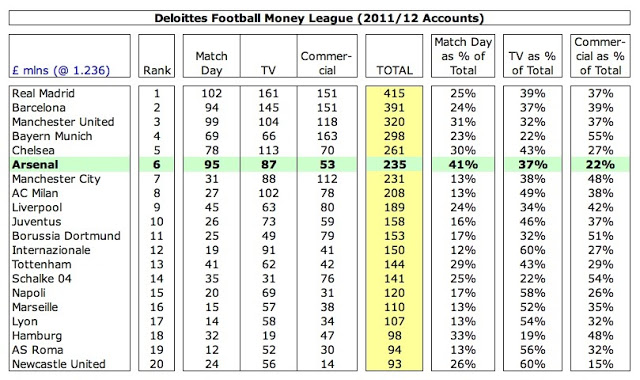 Газидис также сказал: «Наши доходы выведут нас в топ пять самых доходных клубов в мире», что звучит довольно странно, учитывая что «Арсенал» был в пятерке в четырех отчетах Football Money League из последних шести, с тех пор как они переехали на «Эмирейтс». «Челси» обошли «Арсенал» в последнем издании из-за своего успеха в Лиге Чемпионов. По правде говоря, доходы «Арсенала» выше, нежели у подавляющего большинства остальных клубов: их годовой оборот в 235 млн был третьим в Англии в сезоне 2011/12 и наверняка вырастет до более чем 300 миллионов в ближайшие два года. Вышеупомянутая сделка с Эмирейтс принесет дополнительные 20 млн фунтов, также как и предполагаемая сделка с Puma, в то время как новый договор Премьер Лиги с телекомпаниями принесет еще 30 млн.
