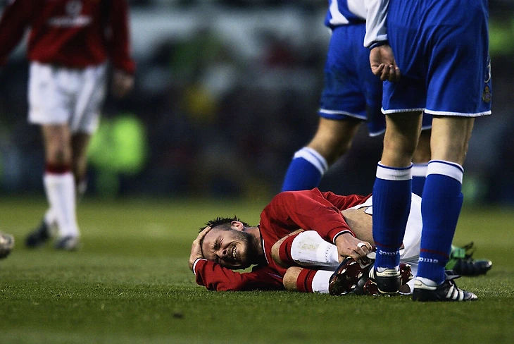 Празднует свой гол в знаменитом камбеке против «Тоттенхема», 29 сентября 2001. Впервые выводит «МЮ» с капитанской повязкой.