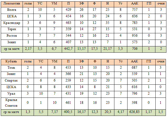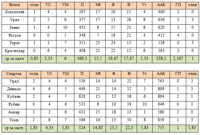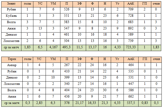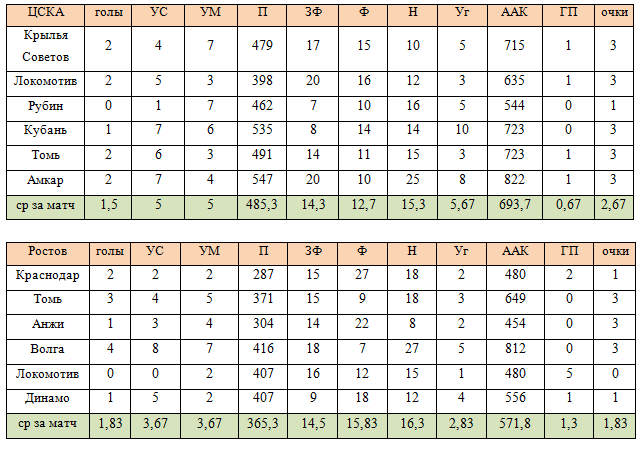 Гол – 50, точная передача (П)– 1, удар в створ (УС) – 10, удар мимо (УМ) – 5, заработанный штрафной в пользу своей команды (ЗФ) – 3, навесы (Н) – 1, пропущенные мячи (ГП), фолы (Ф), угловые (Уг).