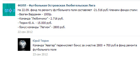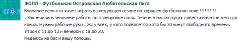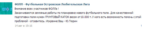 Я думаю, год надо выждать. Пусть травяной газон укоренится, а заодно все выбоины нужно будет выровнять и подсевать траву в проблемных местах. А в 2015-м году возобновить работу Футбольной Островской любительской лиги.
