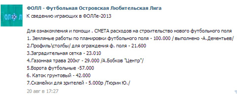 СМЕТА расходов на строительство нового футбольного поля:1. Земляные работы по планировки футбольного поля - 100.000 / выполнено - Д.Дементьев/2. Профиль\столбы/ для ограждения ф. поля - 21.6003. Заградительная сетка - 23.0104. Газонная трава 200кг - 29.000 /А.Бобков "Центр"/5. Ворота футбольные -57.0006. Каток грунтовый - 42.0007. Скамейки для зрителей - 5.000 /Тюрин Ю./