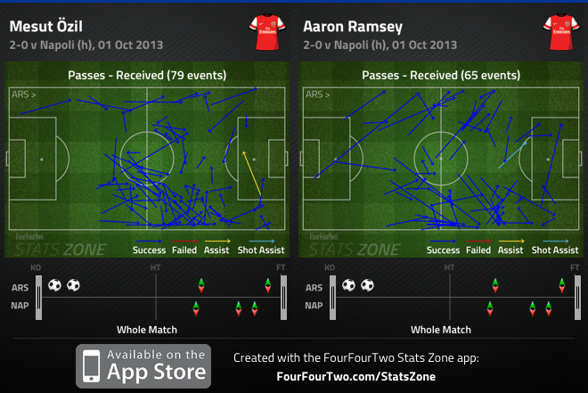 Например, первый гол случился после того, как там оказался Оливье Жиру, уведший с собой Бритоса и создавший пространство для Рэмзи, который убежал от Суньиги. Вся защита «Наполи» сместилась чуть правее для того, чтобы подстраховать зону, и Озил оказался свободным, что позволило ему забить после прострела Рэмзи.