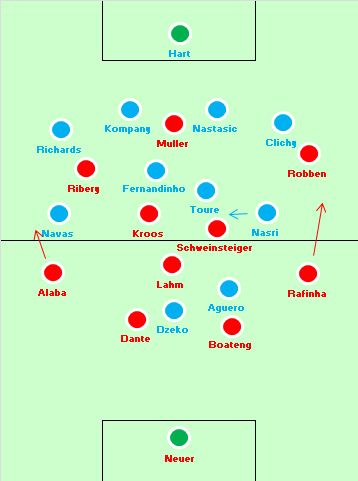 По указанию или из необходимости, Самир Насри часто смещался в центр со своей позиции для того, чтобы помогать Яя Туре и Фернандиньо. Но на деле это лишь добавляло «Сити» проблем – это не улучшало их позиции в центре поля значительным образом, но позволяло Рафинье подключаться в свободное пространство, которое возникало после того, как Насри покидал свою позицию. В первые 25 минут «Бавария» часто переводила мяч на бразильского правого защитника, который забегал по флангу, позволяя тем самым смещаться в центр Арьену Роббену, или, наоборот, сам смещался в центр, когда голландец оставался на фланге.