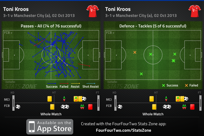 Однако создавать проблемы сопернику таким образом на регулярной основе «Сити» не мог, «Бавария» прессинговала предельно успешно, что привело к тому, что игра по сути проходила лишь на половине поля «Сити». Энергичность Мюллера сыграла ключевую роль, он начинал активный прессинг своей команды. Кроос также был великолепен в отборе мяча на чужой половине поля, что было более заметно в первом тайме, но сыграло определяющую роль во втором, когда Роббен забивал 3-й гол.