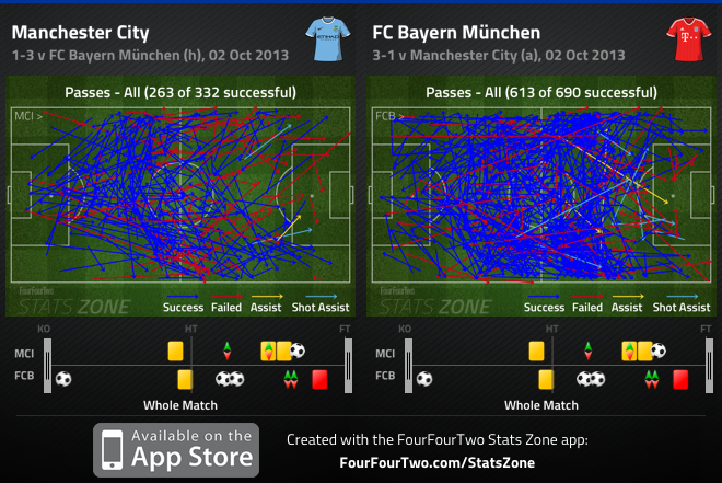 Говоря простым языком, «Сити» и Пеллегрини повели себя чрезвычайно наивно в этом матче, избрав тактику с двумя чистыми форвардами, которые не отрабатывали в обороне в первом тайме. Это позволило «Баварии» полностью контролировать центр поля, а, когда Насри смещался туда, чтобы этому помешать, они оголяли пространство, которое он освобождал на фланге.
