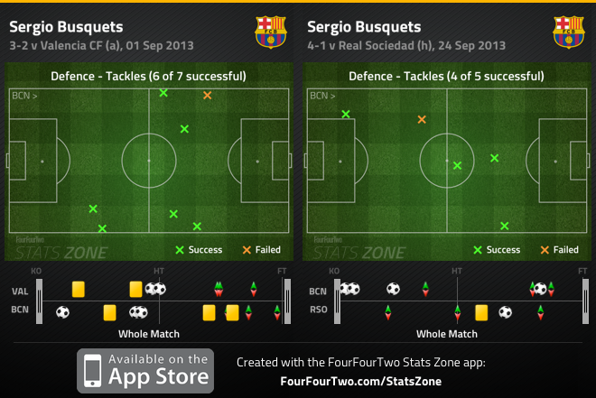 В других матчах мы видим очень высокий прессинг в его исполнении. В игре против «Валенсии» он сначала отобрал мяч, после которого Неймар забил гол, отмененный, впрочем, из-за офсайда, а затем несколько минут спустя проделал тот же прием, после чего Фабрегас отдал голевую передачу на Месси. «Севилье» тоже не повезло – Бускетс перехватил мяч после неудачного выноса, отпасовал Иниесте, который выступил ассистентом для Дани Алвеса. Даже в игре против «Сосьедада», где роль Бускетса была больще оборонительной, он однажды отобрал мяч и пробил в створ ворот. В целом мы видим, что чаще полузащитник отбирает мяч ближе к чужим воротам.
