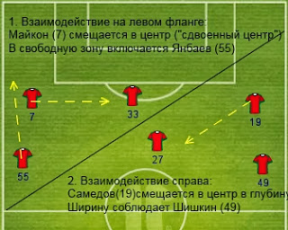 В позиционной атаке инсайды смещались в центр, освобождая зоны для крайних защитников. Майкон чаще организовывал "сдвоенный центр" с НДойе, а Самедов старался играть в глубине, в зоне действия Оздоева, создавая там численный перевес. Вообще, роль крайних защитников в атакующих действиях сложно переоценит: гол и голевая передача. При этом, активные подключения в атаку - это возможность навязать борьбу на чужой половине поля, что и делает "Локомотив".Второй гол "Локомотива" стал результатом активных действий в фазах перехода. Потеря мяча - переход в прессинг - удачный отбор - быстрых переход к атакующим действиям.