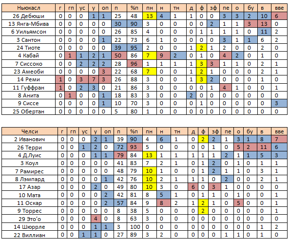 Очень слабый матч провели опорники гостей, собственно они-то и не смогли связать оборону и нападение. Кроме того Рамирес и Лэмпард не преуспели и в черновой работе, у первого всего 1 отбор, 1 перехват и 3 выноса, а у второго: 2 перехвата и 2 выноса. Для сравнения Кабай записал на свой счет 4 перехвата (лучший в матче), 2 отбора и 1 вынос, а кроме этого он вполне успешно дирижировал игрой своей команды в центре поля. Йоан раздал больше всех передач в "Ньюкасле", которых у него набралось 50 штук, а одна из них стала голевой. Кабай навесил со штрафного, а Гуффран оказался расторопнее всех во владениях Чеха.