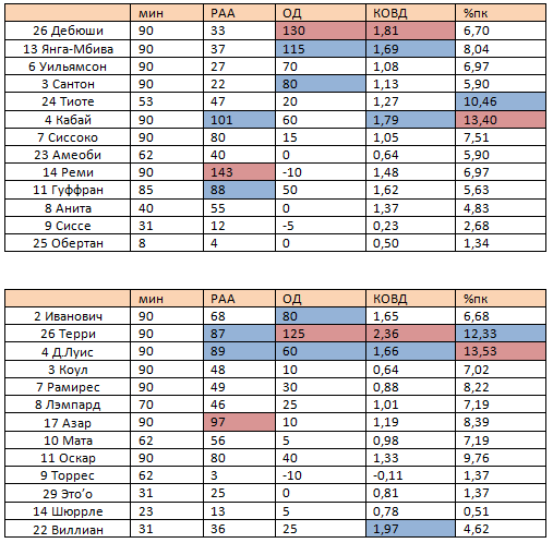 Вся оборонительная линия хозяев провела очень качественный матч. На четверых они выполнил 40 выносов. Особенно выделялись Дебюши и Янга-Мбива. Первый собрал коллекцию из 3 перехватов, 3 отборов, 2 заблокированных ударов и 10 выносов, а второй с 13 выносами и 3 заблокированными выстрелами стал лучшим по этим показателям. Игра Матье во многом способствовала тому, что Азар кроме индивидуальных действий ничем себя почти не проявил. Эден 2 раза пробил по воротам (мимо), 6 раз успешно применил дриблинг и заработал на себе 2 фола. Вообще, из атакующим полузащитников "Челси" можно выделить разве что Оскара, который хоть как-то пытался переломить ход матча. Бразилец раздал 57 передач (3й показатель в команде), из которых 2 были под удар партнерам, 8 раз навесил в штрафную соперника и совершил 5 отборов.