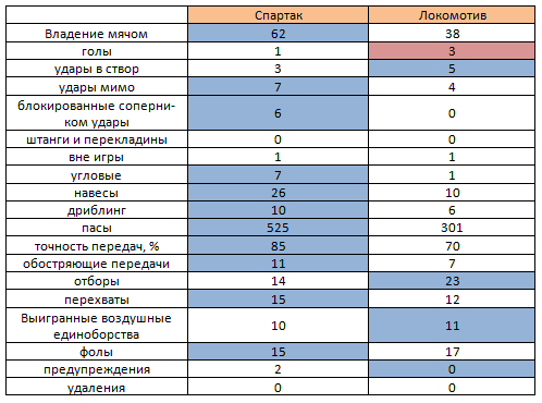 «Спартак» к 17й минуте пропустил 2 гола, поэтому логично, что весь оставшийся матч хозяева пытались отыграться. Они имели территориальное преимущество (62% владения), чаще выполняли угловые (7 против 1) и навесы (26 против 10), а также нанесли на 7 ударов в сторону ворот больше соперника. Вот только 6 из этих выстрелов были успешно заблокированы, а в створ долетели всего 3, для сравнения футболисты «Локомотива» атаковали острее, они 5 раз направляли снаряд в створ ворот, и в 3 случаях Песьяков был бессилен.