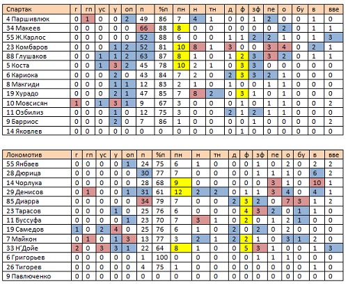 Из игроков «Спартака» сложно кого-то выделять. На своем уровне сыграли разве что Глушаков, Комбаров и Мовсисян. Денис раздал 63 передачи (второй показатель в команде), из которых 2 были обостряющими, нанес 1 удар (в створ), а также записал на свой счет 3 перехвата, 2 отбора и 1 вынос. Он фактически в одиночку сражался в центре поля с Тарасовым и Диарра, так как ни Кариока, ни Коста особенно ему не помогали в черновой работе. Первый сделал 2 перехвата и 1 отбор, второй и вовсе почти не оборонялся. Аргентинец сосредоточился на созидании. Тино 3 раза пробил по воротам и дважды выводил партнеров на ударные позиции, но так как его действия к изменению счета на табло не привели, вряд ли выступление Косты можно назвать удачным.