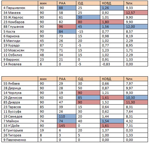 Рейтинг атакующей активности (РАА): гол – 50, голевая передача (заработанный пенальти, забитый пенальти) – 25, точная передача– 1, удар в створ – 10, удар мимо– 5, обостряющая передача – 5, удачный дриблинг– 5, заработанный штрафной – 5, навесы: точные – 3, неточный – 1. Рейтинг оборонительных действий (ОД): перехват - 10, отбор – 10 и блокированный удар – 10, выносы мяча из своей штрафной - 5, фолы – (-5). Коэффициент объема выполненных действий (КОВД) определяется по формуле (РАА+ОД)/мин, то есть он равен сумме выполненных действий футболиста деленной на проведенные минуты. %пк – процент передач игрока от общего количества передач команды.