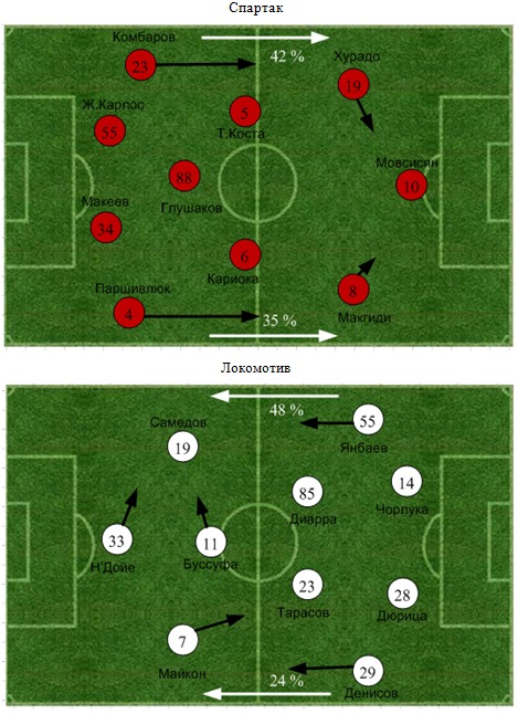 «Локомотив» 48% всех своих атак провел через правый фланг, куда помогать Самедому смещались Буссуфа и чуть реже Н’Дойе. Мбарк был не так заметен, как обычно, на его счету скромная 1 обостряющая передача. Ключевые роли в контратаках были отведены игрокам флангов и нападающему. Самедов нанес 4 удара (больше всех в матче) по воротам Песьякова, из которых 2 попали в створ, а 1 влетел в сетку, еще он 2 раза успешно применил дриблинг, заработал на себе 2 фола и совершил 2 отбора. Майкон в основном создавал моменты для партнеров, он 3 раза выводил их на ударные позиции, и однажды это привело к голу, кроме того он старался помогать в обороне. На его счету 3 отбора, 2 выноса и 1 заблокированный удар. Н’Дойе стал главным героем матча, он 3 раза пробил по воротам (все в створ) и этого ему хватило, чтобы оформить дубль, еще он отметился 1 обостряющей передачей и заработал на себе 3 фола. Спартаковцам так и не удалось сдержать этого нападающего.
