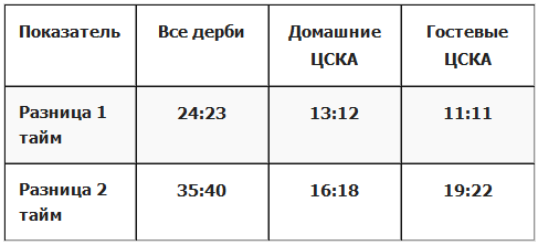 Если рассмотреть результативность команд по таймам, то по этому показателю выраженного преимущества нет ни у одного из соперников. Соотношение мячей в дерби ЦСКА — «Спартак» (1992-2013 гг.)