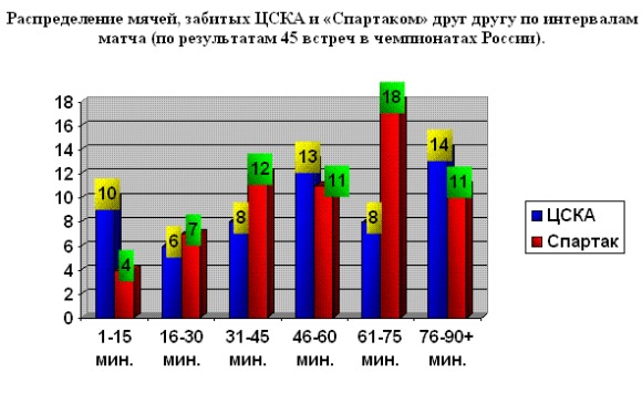 Диаграмма свидетельствует, что и в чемпионатах России периоды активности команд такие же, как и по совокупности всех встреч соперников между собой, начиная с 1936 года. Так, период наибольшей результативности ЦСКА в матчах против «Спартака» приходился на концовки матчей – почти четверть (23,7%) всех своих мячей «красно-синие» забили спартаковцам в последние 15-минутки матчей. Для «Спартака» же всплеск голевой активности наблюдался в середине вторых таймов. 18 мячей, чуть ли не треть (28,6%) от всех забитых в ворота ЦСКА, пришлись на интервал времени между 61-й и 75-й минутами матчей. На протяжении всего матча есть две минуты, наиболее любимые командами. На 90-й минуте матчей ЦСКА забил «Спартаку» 5 мячей, а «красно-белые» в ворота армейцев на 66-й – 4.В структуре мячей, забитых соперниками друг другу, есть различия, о чем свидетельствуют диаграммы ниже.
