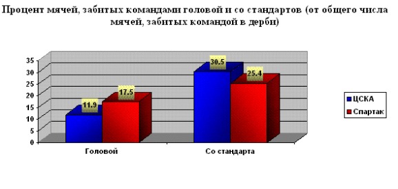 Из приведенной диаграммы видно, что «Спартак» в структуре своих мячей больше предпочитал забивать головой, нежели армейцы. С другой стороны, ЦСКА эффективнее спартаковцев использовал в дерби стандартные положения.