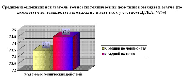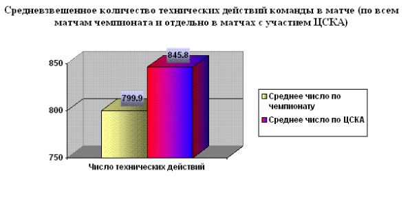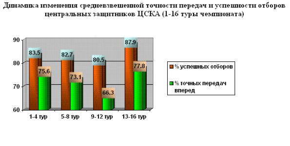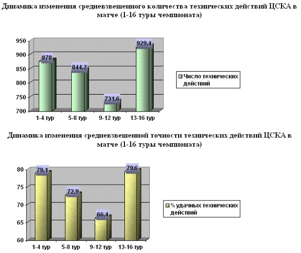Как видно из диаграмм, самым неудачным периодом для армейцев была дистанция с 9 по 12 тур. На эти туры пришлись встречи со «Спартаком», «Динамо», «Тереком» и «Анжи». Если вспомнить порой беспомощную игру ЦСКА против своих соперников и сопоставить с приведенными данными, то многое объясняется провалом в этот период как в объеме совершенных технических действий, так и в их качестве. В то же время дистанция с 13 по 16 тур убеждает в том, что команда «выздоравливает» — объемно-качественные характеристики игры «красно-синих» превзошли на данном этапе показатели стартового отрезка чемпионата. Кстати, показатели последних туров чемпионата сопоставимы со средними показателями игроков ЦСКА аналогичного периода прошлого сезона.
