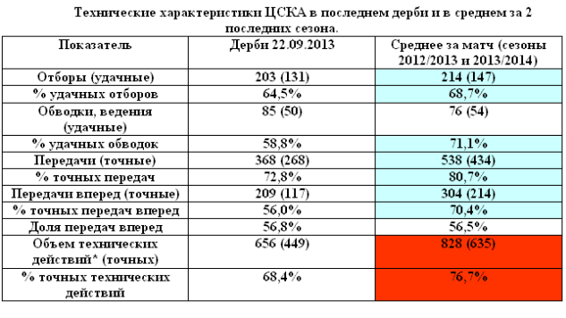 На фоне рассмотренных показателей очевидно, что как команда в целом, так и ее центр обороны успешно выходят из игрового кризиса.Едва ли не с худшими своими техническими характеристиками в сезоне провели футболисты ЦСКА предыдущее дерби (таблица ниже демонстрирует низкое качество игры армейцев в том матче).