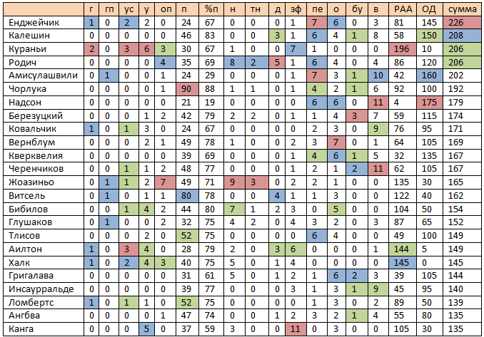 г - гол; гп – голевая передача; ус-удары в створ; у -удары всего; оп – обостряющая передача (передача, после которой партнер по команде наносит удар), п – передачи всего; %п - точность передач, н –навесы, тн – точные навесы; д - удачный дриблинг (обыгрыш один в один); зф –сфолили на нем; пе – перехваты; о – отборы; бу – заблокированные удары; в - выносы мяча из своей штрафной площади. Рейтинг атакующей активности (РАА): гол – 50, голевая передача (заработанный пенальти, забитый пенальти) – 25, точная передача– 1, удар в створ – 10, удар мимо– 5, обостряющая передача – 5, удачный дриблинг– 5, заработанный штрафной – 5, навесы: точные – 3, неточный – 1. Рейтинг оборонительных действий (ОД): перехват - 10, отбор – 10 и блокированный удар – 10, выносы мяча из своей штрафной - 5. Сумма - это РАА+ОД.