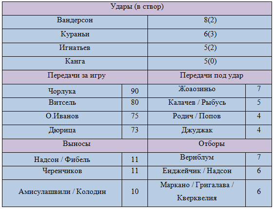 Кроме фланговых защитников в составе «Краснодара» выделялись Жоаозиньо и Вандерсон. Первый вел игру своей команды в атаке, он раздал больше всех передач – 49 и целых 7 раз выводил партнеров на ударные позиции – это лучший показатель во всем туре, не удивительно, что именно этот бразилец и стал автором победной голевой передачи. Вандерсон хотя и не забил, зато угрожал регулярно, он целых 8 раз пробил по воротам – больше всех во всем туре, правда, в створ попал только дважды.