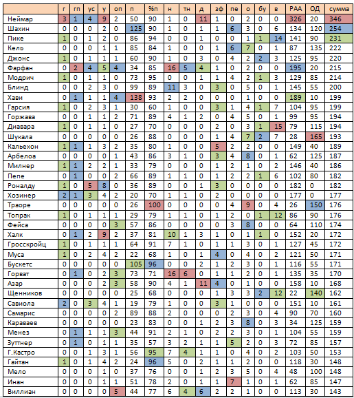 г - гол; гп – голевая передача; ус-удары в створ; у -удары всего; оп – обостряющая передача (передача, после которой партнер по команде наносит удар), п – передачи всего; %п - точность передач, н –навесы, тн – точные навесы; д - удачный дриблинг (обыгрыш один в один); зф –сфолили на нем; пе – перехваты; о – отборы; бу – заблокированные удары; в - выносы мяча из своей штрафной площади. Рейтинг атакующей активности (РАА): гол – 50, голевая передача (заработанный пенальти, забитый пенальти) – 25, точная передача– 1, удар в створ – 10, удар мимо– 5, обостряющая передача – 5, удачный дриблинг– 5, заработанный штрафной – 5, навесы: точные – 3, неточный – 1. Рейтинг оборонительных действий (ОД): перехват - 10, отбор – 10 и блокированный удар – 10, выносы мяча из своей штрафной - 5. Сумма - это РАА+ОД.