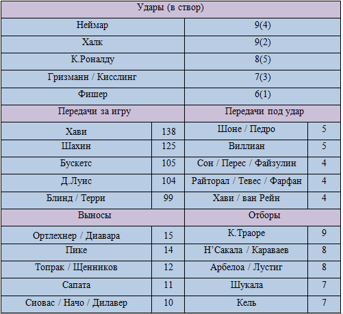 В итоге бразилец нанес 9 ударов по воротам (лучший в туре), из которых 4 попали в створ, а 3 влетели в сетку, выполнил 1 результативную передачу и целых 11 раз успешно применил дриблинг (лучший в туре). Собственно Неймар и стал главным героем последнего тура группового этапа Лиги Чемпионов. Кроме него отлично показал себя Пике. Центральный защитник не только уверенно справился со своей основной работой, записав на свой счет 1 отбор, 1 заблокированный удар и 14 выносов, он еще и раздал 86 передач и забил первый гол в этом матче. Как обычно дирижёрская палочка находилась в руках Хави. Этот мастер сделал 138 пасов – лучший в туре, из которых 4 были под удар партнерам, а один привел к голу, также впечатляет точность его действий – 93% его передач доходили до адресатов.