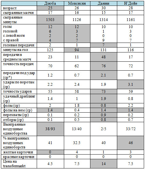 Дзюба – единственный представитель отечественной школы, кто смог составить конкуренцию легионерам, к тому же он в отличие от своих оппонентов играет не за лидеров чемпионата, а за середняка турнирной таблицы. Главным преимуществом Артема перед своими соперниками является игра в воздухе, он гораздо чаще других вступал в верховые дуэли – 93 раза, для сравнения у ближайшего преследователя Н’Дойе – 72. Такая активность позволила Дзюбе из своих 12 мячей 6 отправить в сетку ворот головой. Также стоит отметить, что, несмотря на свои габариты по технической оснащенности Артем из представленной четверки уступает только Данни, что подтверждают его 1,4 удачные обводки в среднем за матч (у Данни этот показатель 1,9). Дзюба относится к той категории форвардов, кто всегда готов сыграть на партнеров, он в среднем за встречу по 1,2 раза выводит игрока своей команды на ударную позицию, лучше показатель только у Дании – 2,1. Можно смело говорить, что Артем неслучайно взобрался на вершину списка лучших нападающих чемпионата.