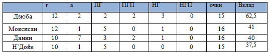 г – голы, а - ассисты, ПГ – победный гол, ПГП – победная голевая передача, НГ – гол, принесший ничью, НПГ – голевая передача, принесшая ничью, вклад – очки игрока, разделенные на очки команды.