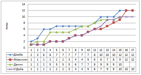 Теперь посмотрим на саму бомбардирскую гонку, как игроки пополняли свою коллекцию забитых мячей.