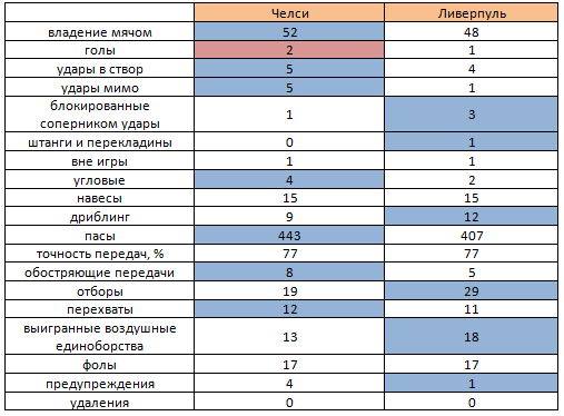 Как видим, по большинству статистических показателей установилось примерное равенство, игроки "Челси" немного больше владели мячом (52%) и чаще били по воротам (11 против 8), гости в свою очередь лучше смотрелись в воздухе (18 выигранных воздушных единоборств против 13) и при отборе мяча (29 отборов против 19). Можно сказать, что если бы матч завершился вничью, то это никого бы не удивило.