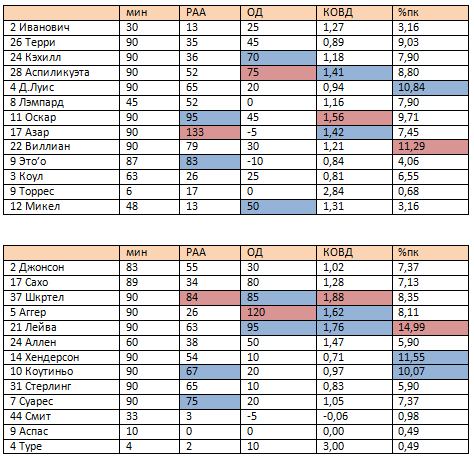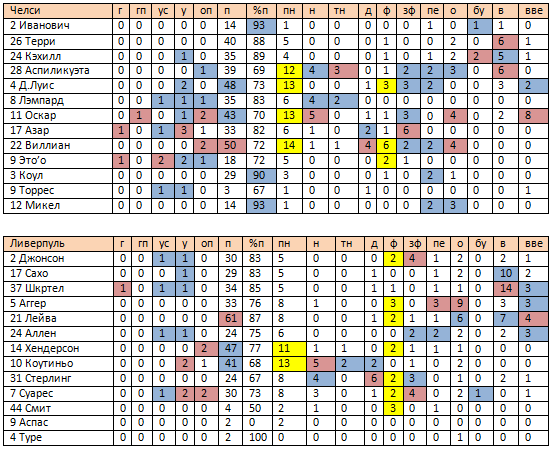 Во втором матче к ряду слабо себя показали полузащитники «Ливерпуля», отвечающие за созидание. Хендерсон, Коутиньо и Стерлинг на троих произвели 2 выстрела по воротам и дважды выводили партнеров на ударные позиции, для сравнения Азар, Виллиан и Оскар нанесли 4 удара и еще 5 раз создавали моменты для партнеров.