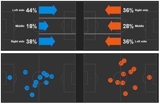Помимо забитого мяча на счету бельгийца значатся 3 удара, 1 обостряющая передача, 2 успешные обводки и целых 6 заработанных на себе штрафных. Азар вместе с Виллианом отвечали за флаги, они регулярно менялись местами и при возможности смещались в центр. Бразилец был не так продуктивен, как Эден, но в отсутствии старания его обвинить нельзя. Виллиан раздал больше всех передач в составе своей команды – 50, из которых 2 были под удар партнерам, кроме того он 4 раза успешно применил дриблинг, заработал на себе 2 фола и что должно быть особенно приятно для поклонников "Челси" довольно прилично поработал в обороне, сделав 2 перехвата и 4 отбора.