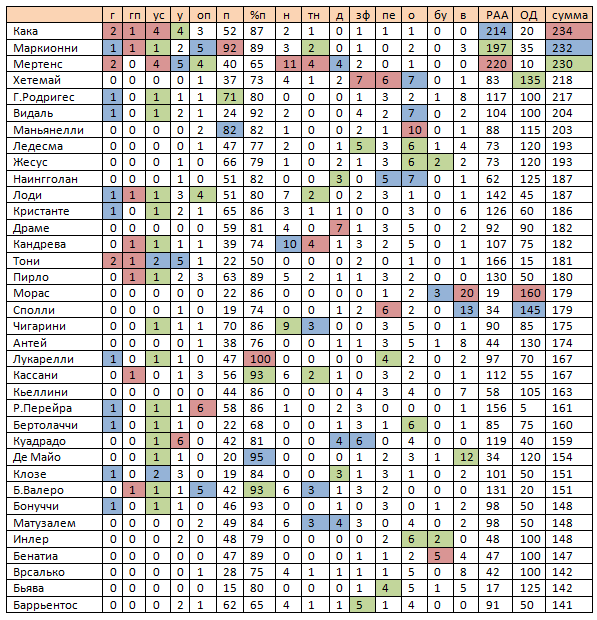 г - гол; гп – голевая передача; ус-удары в створ; у -удары всего; оп – обостряющая передача (передача, после которой партнер по команде наносит удар), п – передачи всего; %п - точность передач, н –навесы, тн – точные навесы; д - удачный дриблинг (обыгрыш один в один); зф –сфолили на нем; пе – перехваты; о – отборы; бу – заблокированные удары; в - выносы мяча из своей штрафной площади. Рейтинг атакующей активности (РАА): гол – 50, голевая передача (заработанный пенальти, забитый пенальти) – 25, точная передача– 1, удар в створ – 10, удар мимо– 5, обостряющая передача – 5, удачный дриблинг– 5, заработанный штрафной – 5, навесы: точные – 3, неточный – 1. Рейтинг оборонительных действий (ОД): перехват - 10, отбор – 10 и блокированный удар – 10, выносы мяча из своей штрафной - 5. Сумма - это РАА+ОД.