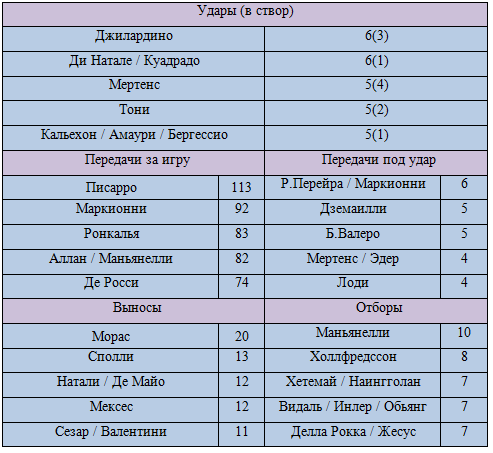 Команда Гарсии проиграла, чем с большим удовольствием воспользовались футболисты «Наполи», уверенно обыграв «Сампдорию». Пока залечивает травмы Гамшик на авансцену вышел Мертенс. Именно дубль бельгийца и обеспечил его команде уверенную победу. Дрис был самым опасным игроком в составе хозяев в этом матче. Он нанес 5 ударов (4 в створ), сделал 4 обостряющие передачи, выполнил 11 навесов и 4 раза успешно применил дриблинг. Очевидно, что Мертенс успешно вписался в новый коллектив, в этом сезоне по системе «гол+пас» у него уже 4+3. Помимо него у победителей выделялись Инлер, который сосредоточился на разрушении атак соперника (2 перехвата, 6 отборов и 2 заблокированных удара), и Дземаили, который целых 5 раз выводил партнеров на ударные позиции.