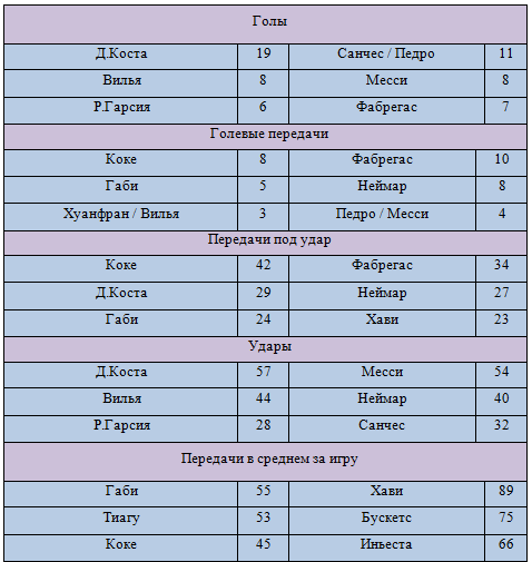 Хави, например, забил уже 7 по гол плюс пас, если взять данные за полсезона ( без учета последней игры против Хетафе) , например, по разрезающим пасам, то Сеск -17, Суарес им Коутиньо -9, Хави, Иньеста, Силва, Уилшер -8.