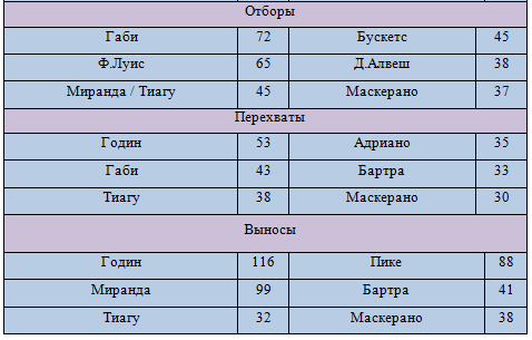 Помимо опорников серьезно попотеть придется и защитникам «Атлетико». Основной паре оборонцев хозяев не позавидуешь. Миранда и Годин в целом демонстрируют довольно стабильную игру. Они уверенно расчищают собственную штрафную площадь: у первого 99 выносов, у второго – 116 для сравнения лучший игрок «Барселоны» по этому показателю Пике имеет в своем активе только 88 подобных действий. Кроме того Миранда очень неплох в отборе (45 – третий в команде), а Годин является лидером по перехватам (53). Очень интересное сражение может развернуться на левом фланге «Атлетико», где встретятся два бразильца Фелипе Луис ( его участие под вопросом) и Дани Алвеш. Оба этих парня любят и умеют подключаться к атакам своих команд, а плюс к этому очень неплохо действуют в отборе. У представителя хозяев 65 отборов в этом сезоне, а у оппонента 38 (вторые показатели в своих клубах).