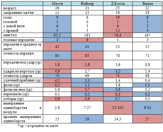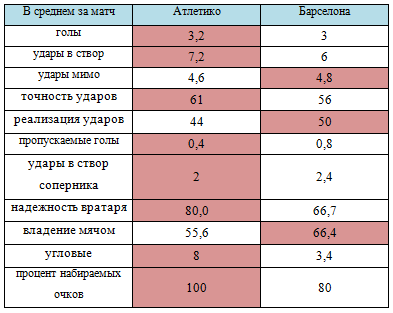Ближе всего по уровню игры к нападающим «Барселоны» из игроков «Атлетико» подобрался Д.Коста. Диего не так техничен, как его оппоненты (всего 1,4 успешные обводки) и не так активен при розыгрыше мяча (всего 23 аса в среднем), зато в плане вколачивания мячей в сетку он ничем не хуже. Неслучайно в списке лучших бомбардиров чемпионата Испании этот игрок уступает Роналду только 1 гол. Диего 19 раз поражал ворота соперников, и в среднем на одно взятие ворот ему требуется всего 79 минут. Отметим, что бразилец хотя и является правшой (12 голов), но может приложиться и с левой (6 мячей). Из участников предстоящего матча именно от него и от Месси стоит ждать наибольшего количества выстрелов по воротам, Коста в среднем наносит по 3,2 удара, а Лионель по 4,9.