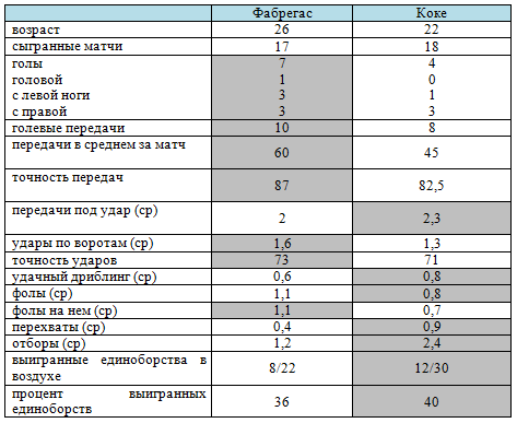 Конечно, по части созидания Коке пока уступает Фабрегасу. Сеск в этом сезоне забил целых 7 мячей, а добавив к ним 10 результативных передач, вышел не первое место по системе «гол+пас» в своей команде. У Коке всего 4 гола и 8 ассистов, он с большим процентом брака раздает передачи (82,5% против 87) и реже угрожает воротам соперника (1,3 удара против 1,6). Зато игрок «Атлетико» более старателен в обороне, он превосходит своего оппонента и по перехватам (0,9 против 0,,4), и по отборам (2,4 против 1,2), и по выигранным воздушным единоборствам. Также отметим, что Коке в среднем за игру по 2,3 раза выводит своих партнеров на ударные позиции, у Фабрегаса этот показатель немного меньше и равен 2. Цифры нам еще раз доказывают, что неслучайно за Коке выстроилась настоящая очередь из больших клубов. Это очень талантливый игрок, он будет еще расти, ведь ему всего 22 года.