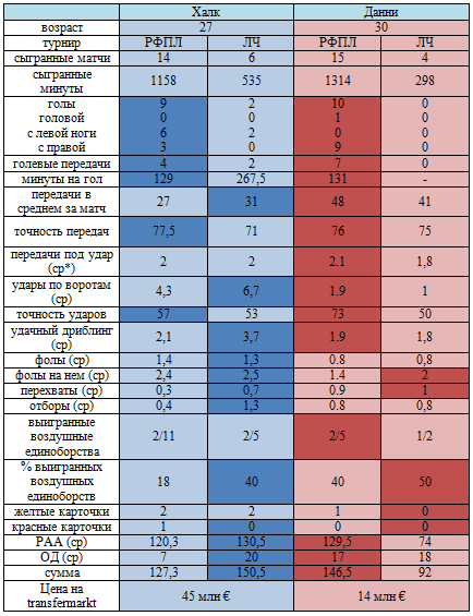Вначале посмотрим на статистику игроков в этом сезоне в чемпионате России и групповом этапе Лиги чемпионов.