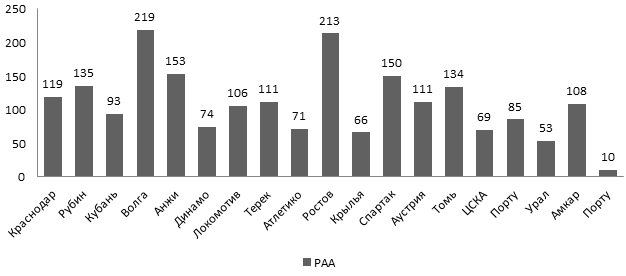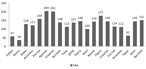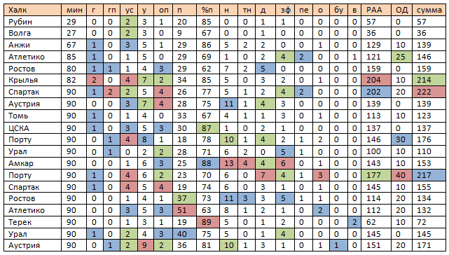 Рейтинг атакующей активности (РАА): гол – 50, голевая передача (заработанный пенальти, забитый пенальти) – 25, точная передача– 1, удар в створ – 10, удар мимо– 5, обостряющая передача – 5, удачный дриблинг– 5, заработанный штрафной – 5, навесы: точные – 3, неточный – 1. Рейтинг оборонительных действий (ОД): перехват - 10, отбор – 10 и блокированный удар – 10, выносы мяча из своей штрафной - 5. Сумма - это РАА+ОД.
