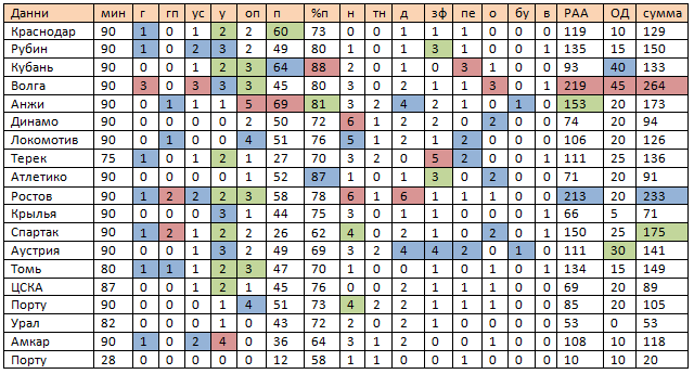 г - гол; гп – голевая передача; ус-удары в створ; у -удары всего; оп – обостряющая передача (передача, после которой партнер по команде наносит удар), п – передачи всего; %п - точность передач, н –навесы, тн – точные навесы; д - удачный дриблинг (обыгрыш один в один); зф –сфолили на нем; пе – перехваты; о – отборы; бу – заблокированные удары; в - выносы мяча из своей штрафной площади.