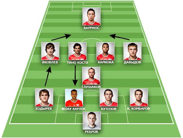 Стартовый вариант отличался мощным центральным кулаком: Глушаков, Тино Коста, Кариока. В остальном до перерыва сочетания красно-белых выглядели непривычно. Уже достаточно опытный Яковлев на левом краю, а под ним – юный Ходырев. Справа обратная картина: в обороне уверенный в себе Кирилл Комбаров и многообещающий Давыдов впереди. Такая же смесь в центре защиты: видавший виды Жоау Карлос с рослым Кутеповым, который вроде как всегда рядом с основой, но потому играть толком не играет – ни за молодежку, ни за "Спартак-2".