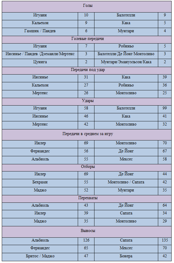 Теперь скажем несколько слов о защитниках команд. Наиболее стабильным звеном в обороне «Милана» является Сапата. Он лидирует в команде по выносам – 135 и занимает вторые места по перехватам – 34 и отборам – 42. У «Наполи» выделяются Маджо и Альбиоль. Первый оккупировал третьи строчки по перехватам -35, отборам -52 и выносам – 47, второй лидирует по количеству перехватов – 43 и лучше других вычищает собственную штрафную площадь – 126 выносов.