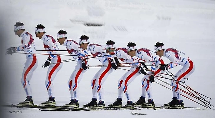 Французский лыжник Жан-Марк Гайяр бежит 15 км.