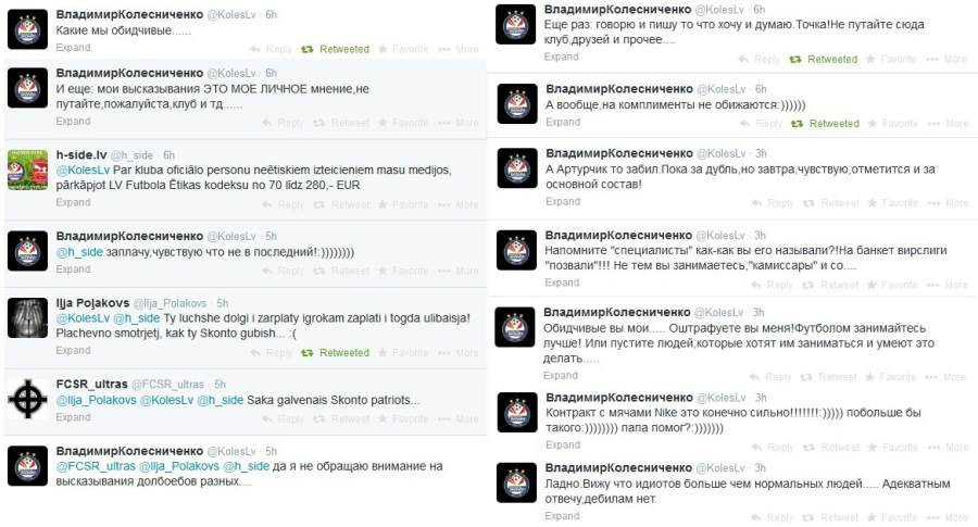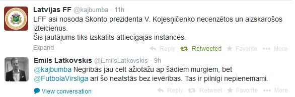 "ЛФФ осуждает президента "Сконто" В.Колесниченко." Так же скорее Колеснечнко заплатит штраф.