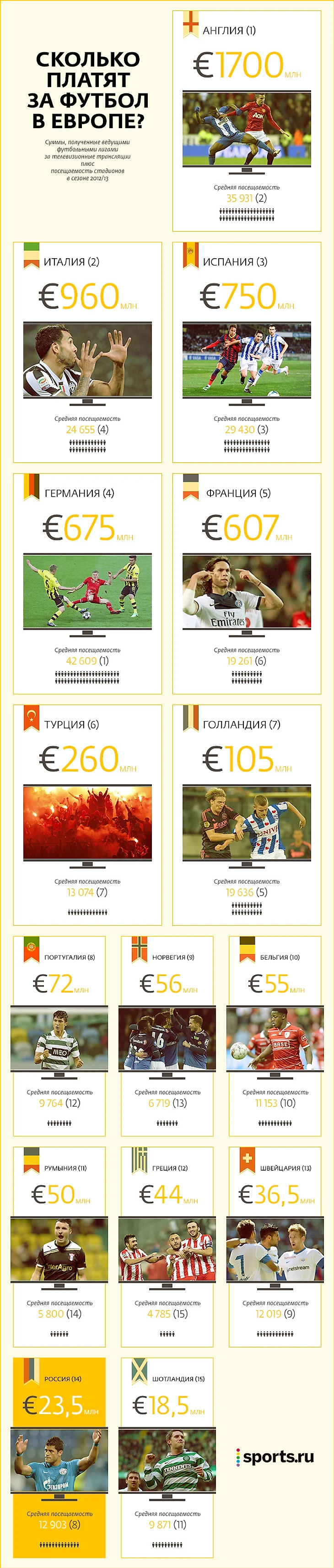А вот посещаемость порадовала. До топов, конечно, не дотягиваем, но сразу после них вместе с турками - приятно. Даже в Португалии и Шотландии меньше ходят.